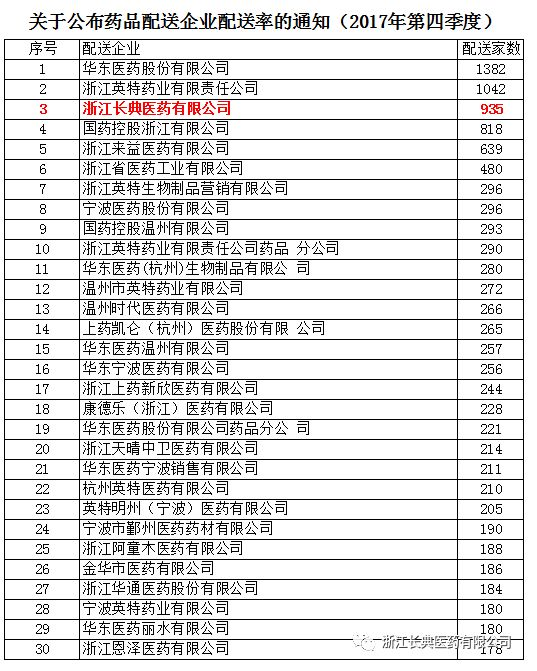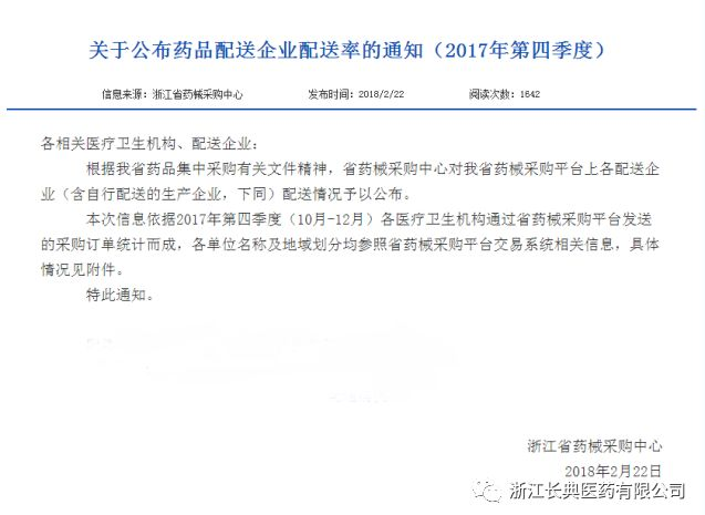 關于公布藥品配送企業配送率的通知(2017年第四季度)