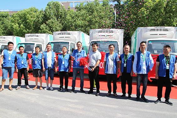 下午2點,交付儀式正式拉開帷幕,現場愈加熱鬧非凡,金慶鈴全體人員列隊歡迎浙江長典醫藥有限公司的司機師傅們,并感謝了浙江長典醫藥有限公司對慶鈴五十鈴600P冷藏車的支持與厚愛。