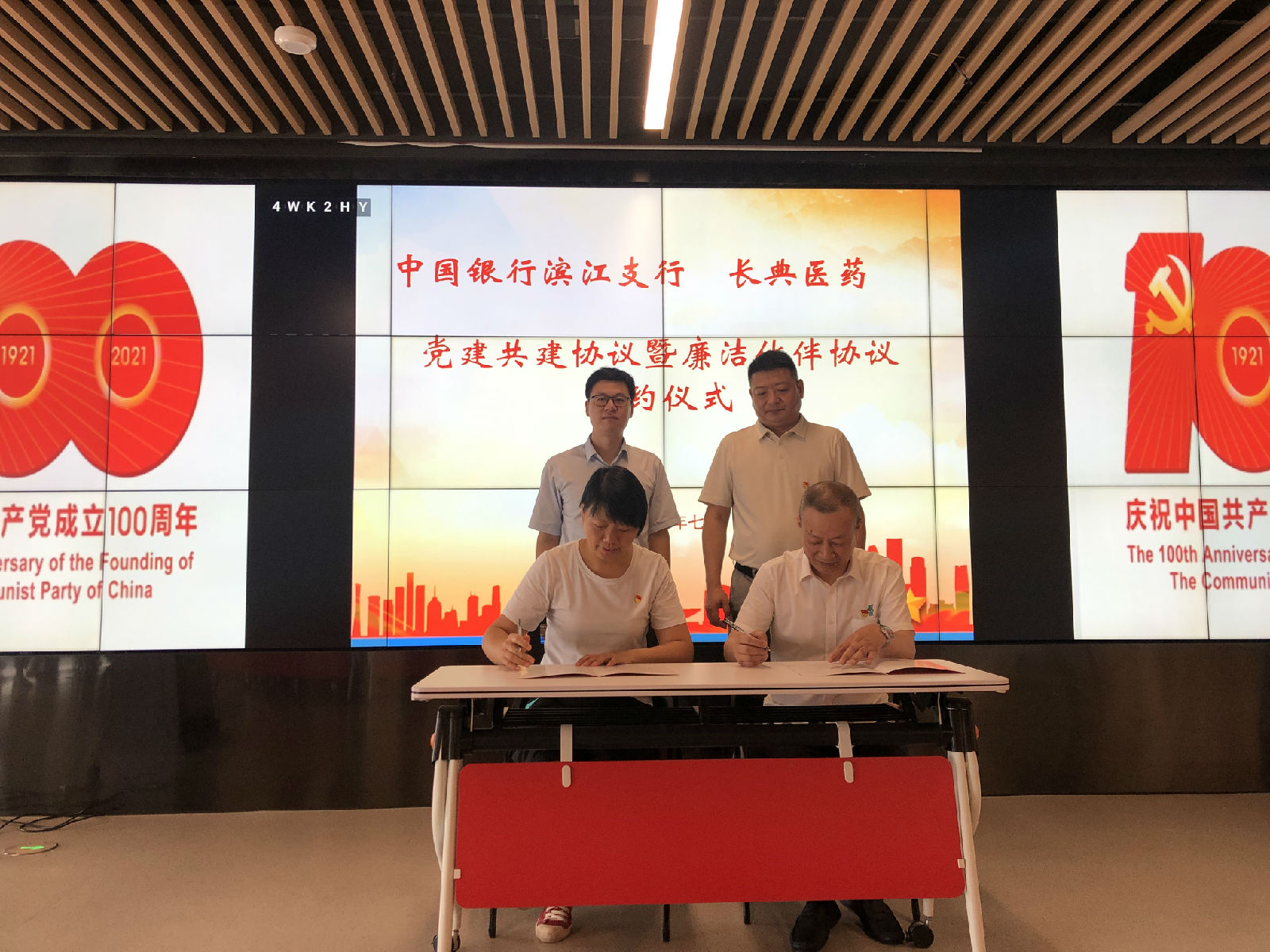 隨后,浙江長典醫藥黨支部書記徐國興與中國銀行濱江支行黨總支委員、副行長鄒永華代表雙方簽署了黨建共建協議暨廉潔伙伴協議。